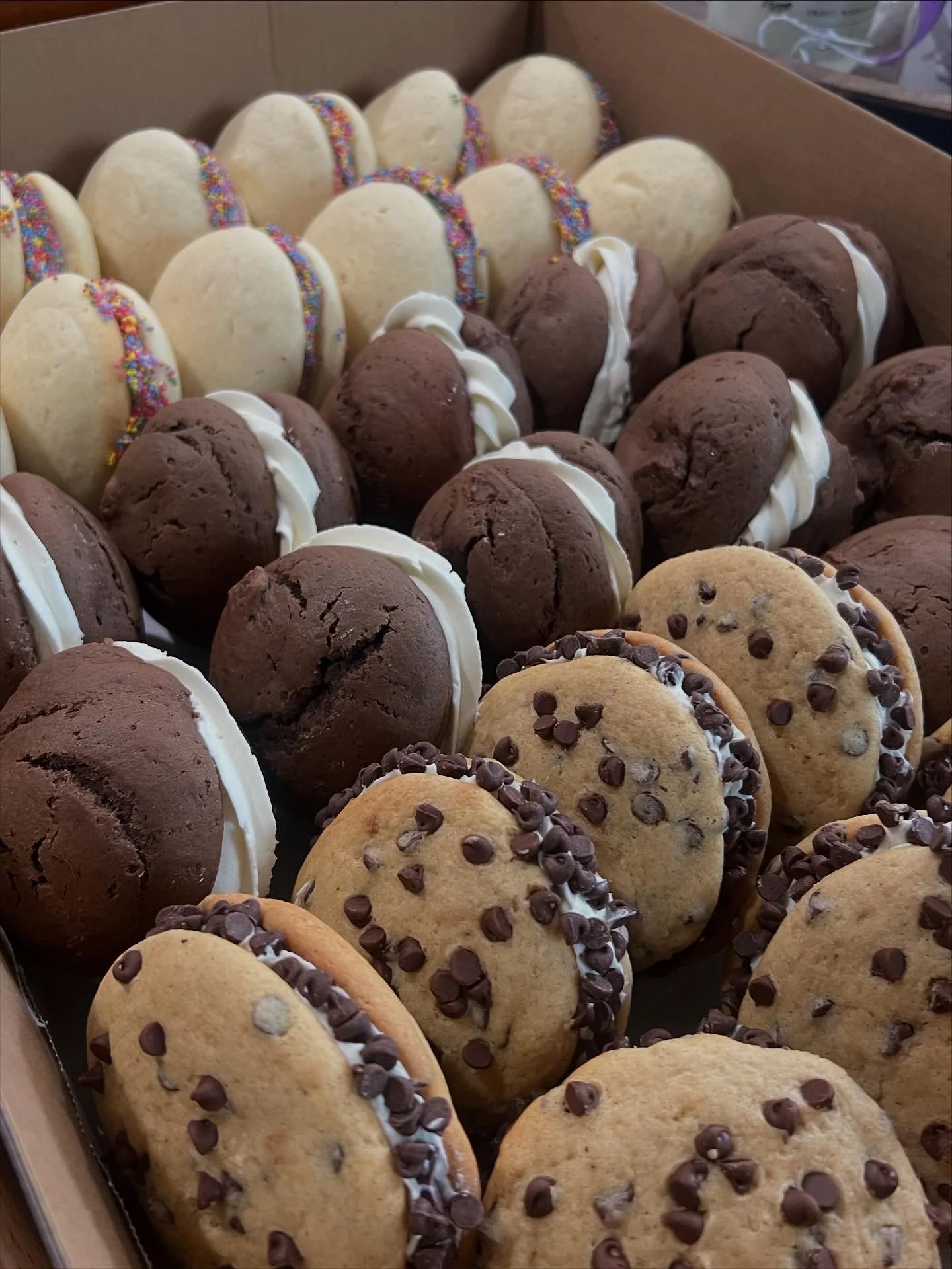A Whoopie Pie is what happens when you combined a cookie and a cupcake. These handheld goodies are crafted with 2 cake style cookies filled with a sweet and creamy filling. Our Signature Whoopie Pies come in a wide variety of flavors from Classic to Snickerdoodle to our fan Favorite Chocolate Chip. We also have seasonal flavors including Key Lime Pie and Spiced Pumpkin. Try one of our Signature Whoopie Pies today for something a little different for your next event!